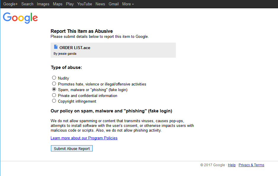 Google Drive Allows Malware to Remain Online for 91 Days (and counting) -  [UPDATED 2017-11-10]